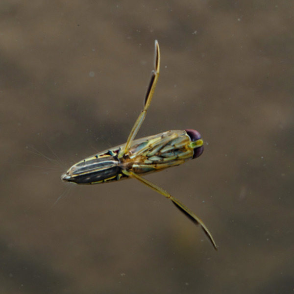 在池塘或濕地裡,你可能會遇到一種特別的水生昆蟲——仰泳椿。牠和小划椿一樣都是常見的「水上高手」,但最大的不同是:仰泳椿是翻著身子游泳的!牠背部朝下、肚子朝上,就像倒立在水中。